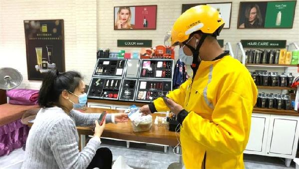 ????3月30日晚開始,市城區不少市民在收到外賣的同時還收到了一張防疫宣傳小卡片,卡片上印有“防疫不放松 堅持戴口罩”的健康提示、“早安、午安、晚安,平平安安”的暖心祝福和志愿者招募二維碼。據統計,共有1000余名外賣騎手化身防疫宣傳員。圖為外賣小哥送外賣的同時給市民遞上防疫宣傳小卡片。夏孟琦 馮順前 攝