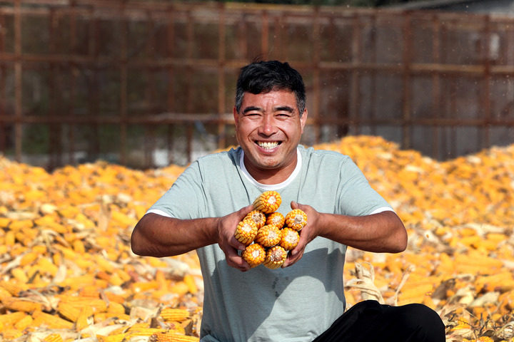 9月22日,在河南焦作博愛縣磨頭鎮崔莊村,“70后”崔衛民展示今年豐收的玉米。新華社發(程全 攝)