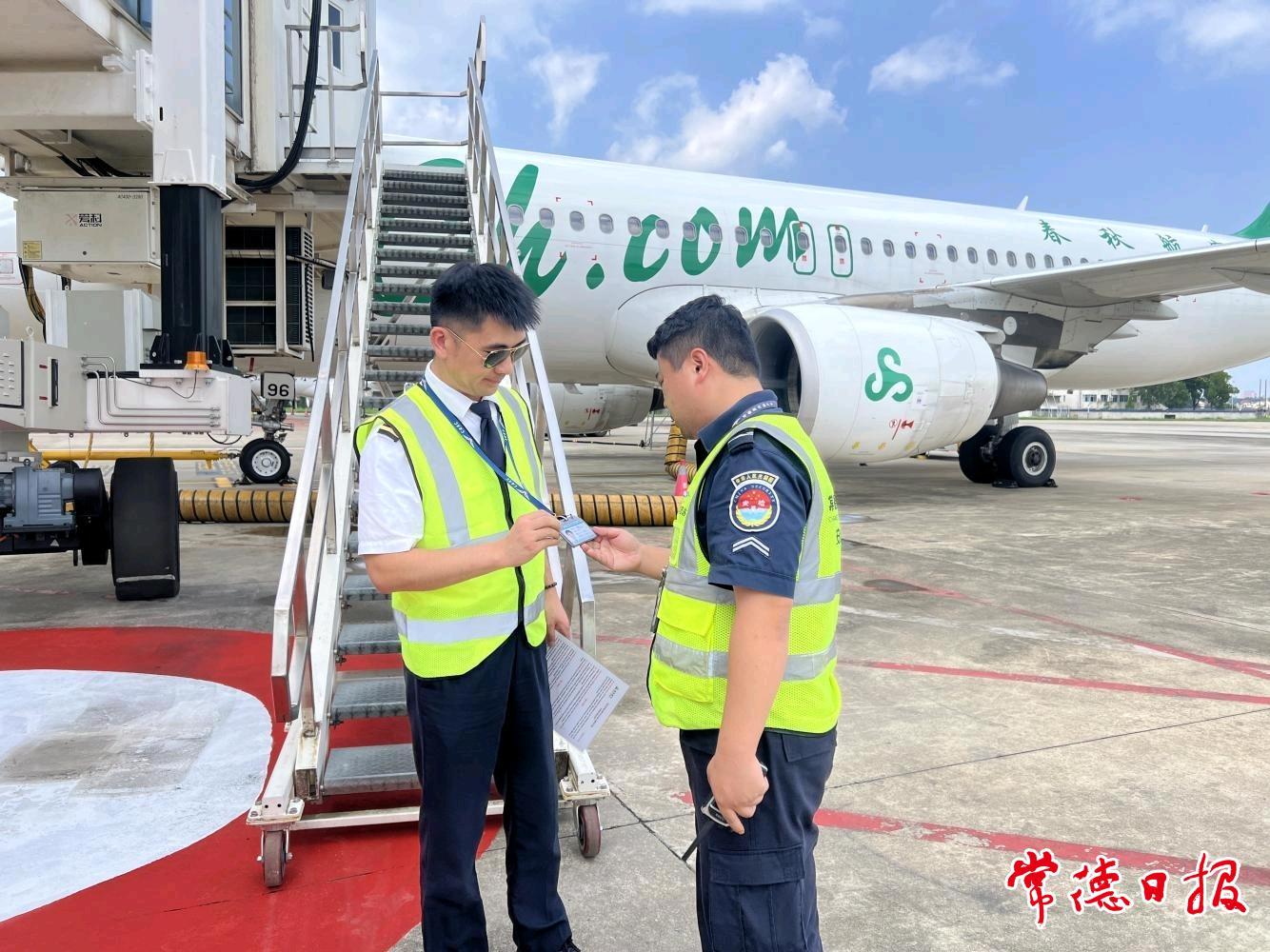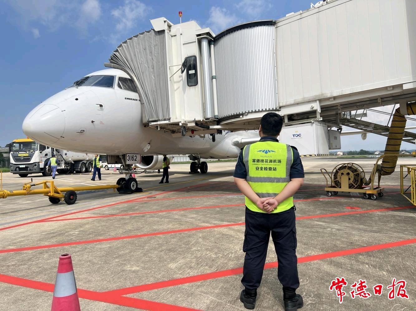 8月2日清晨,常德桃花源機場機坪已開啟“炙烤模式”,一覽無余地暴曬在熱辣辣的陽光中。一群身著黑色制服的飛機監護員,又開始了一天的忙碌。