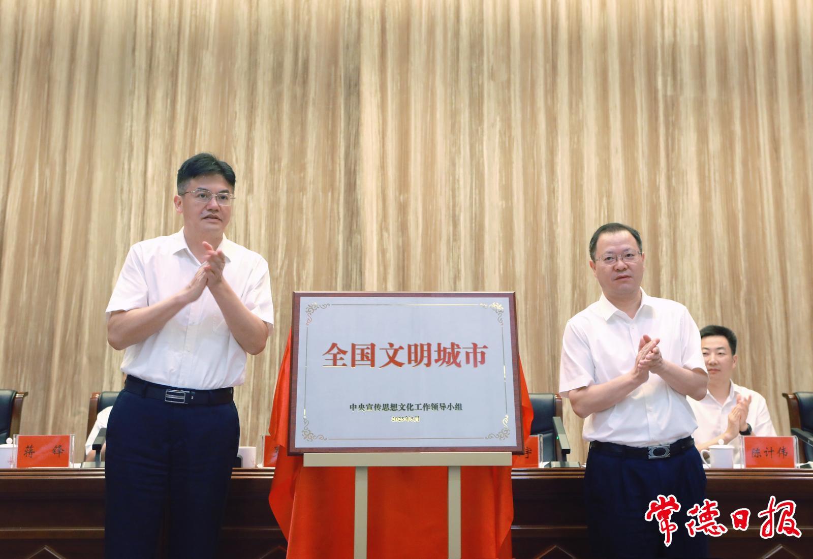 會上,與會人員觀看了常德市創建全國文明城市工作宣傳片。相關市領導為常德市獲得認定命名的第七屆全國文明村鎮、文明單位和第三屆全國文明家庭、文明校園授牌,為“全國文明城市”牌匾揭牌。