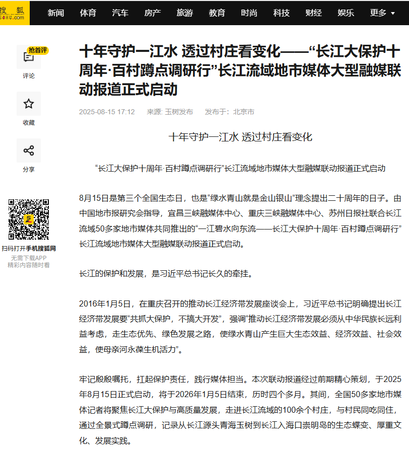 本次聯(lián)動(dòng)報(bào)道歷時(shí)四個(gè)多月,53家地市媒體記者走進(jìn)長(zhǎng)江流域的100余個(gè)村莊,通過(guò)蹲點(diǎn)調(diào)研,記錄從長(zhǎng)江源頭青海玉樹(shù)到長(zhǎng)江入海口崇明島的生態(tài)蝶變、厚重文化、發(fā)展實(shí)踐。其間,各媒體將建立報(bào)道協(xié)同機(jī)制,發(fā)揮媒體新質(zhì)生產(chǎn)力優(yōu)勢(shì),以圖、文、視頻、手繪長(zhǎng)圖等形式推出全媒體報(bào)道,并通過(guò)國(guó)際傳播渠道進(jìn)行對(duì)外傳播。