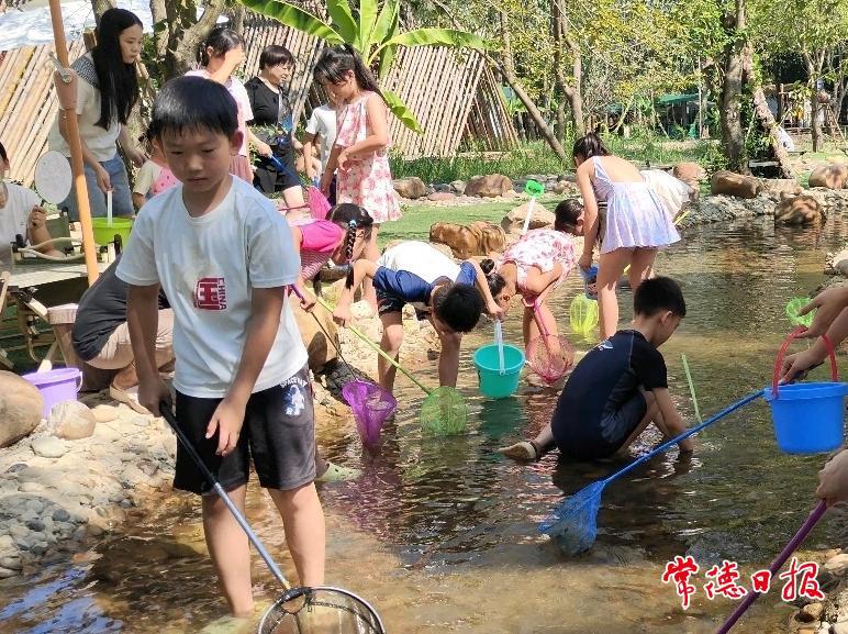 淺水區里,孩子們擼起袖子、提著小網兜,專注地盯著水中游動的泥鰍?!白サ嚼玻 鼻宕嗟臍g呼聲不時響起,孩子們小手攥著裝有泥鰍的玻璃瓶,臉上滿是雀躍。亮黃色的鴨子小船上,他們有的握著船槳輕輕晃動,看到魚兒游過,直接棄船摸魚,歡笑聲隨著水波擴散。