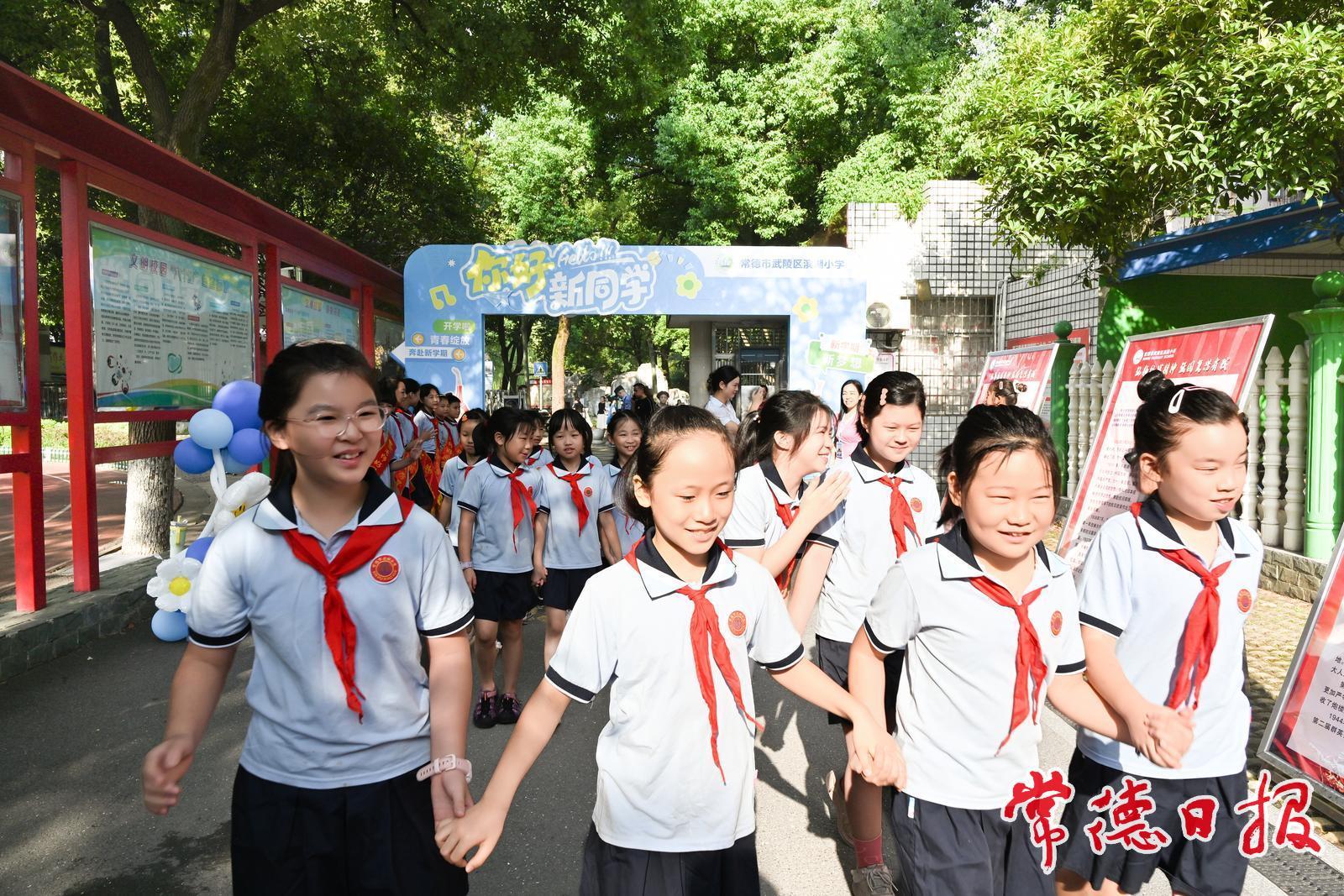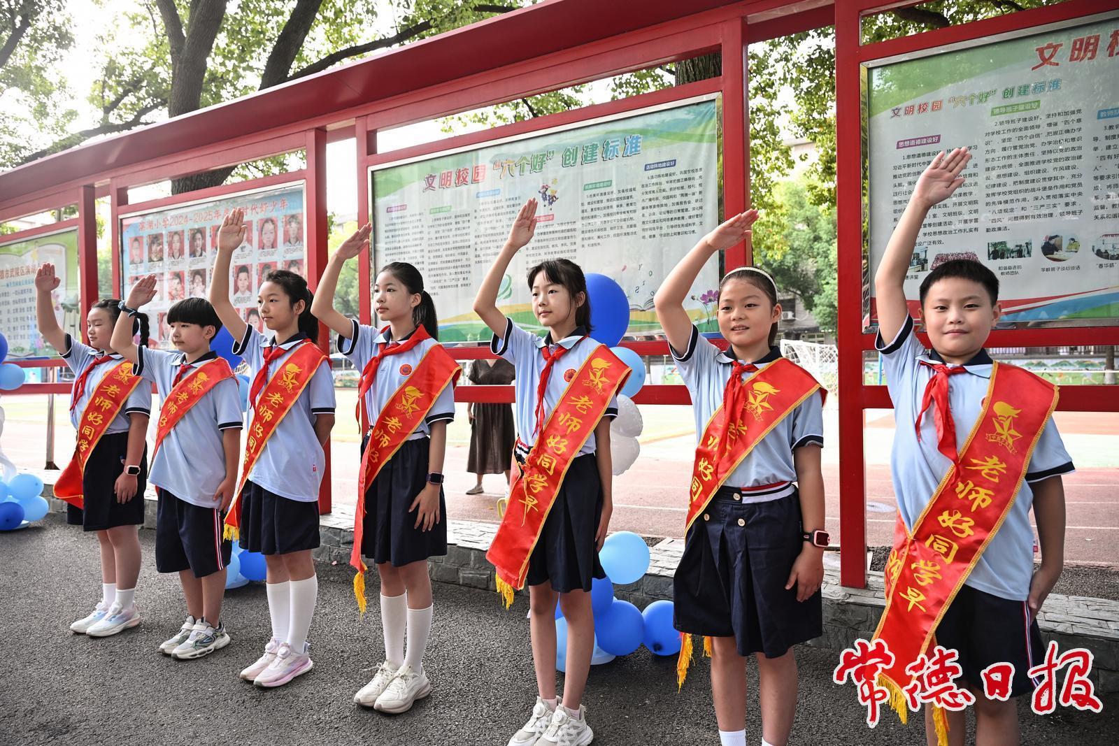 常德日?qǐng)?bào)記者 姚璇 文/圖 8月31日清晨,陽光灑在常德市武陵區(qū)濱湖小學(xué)操場(chǎng)上。沉寂了一個(gè)暑假的校園再度沸騰,孩子們穿著整潔的校服、佩戴鮮艷的紅領(lǐng)巾,快步穿過寫滿“你好新同學(xué)”“新學(xué)期新夢(mèng)想”等標(biāo)語的卡通拱門。與往常不同的是,這一次,迎接他們的不僅是老師和同學(xué),還有一群聲音稚嫩卻目光堅(jiān)定的“小小紅色宣講員”。