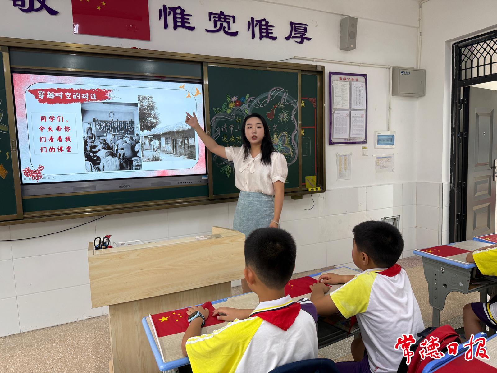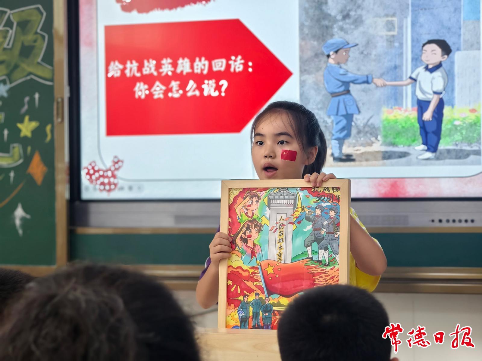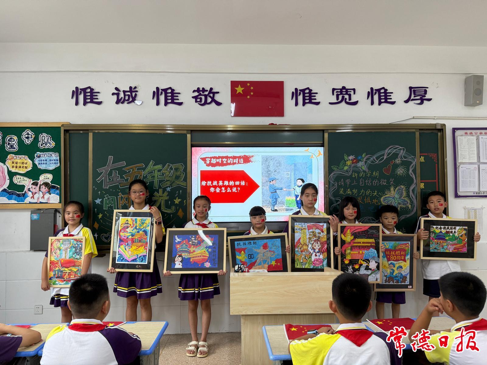 常德日報記者 黃云霞 通訊員 高虹 劉彬彬 文/圖 “平型關大捷打破了日軍不可戰勝的神話,狼牙山五壯士用生命詮釋了民族氣節!”9月1日上午,武陵區紫菱小學45班教室內,班主任肖伊含以抗戰故事為核心,上了一堂別開生面的思政課。