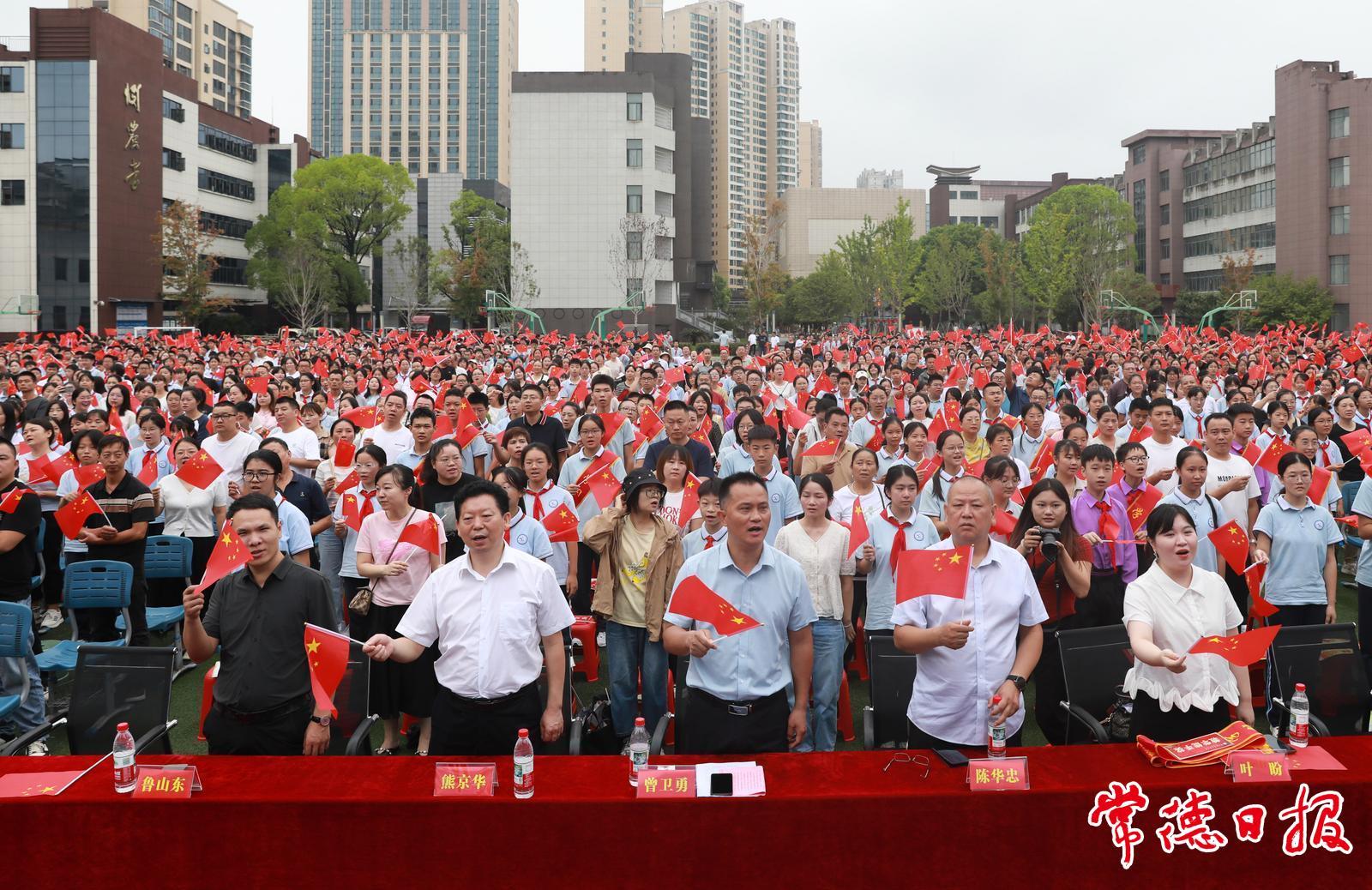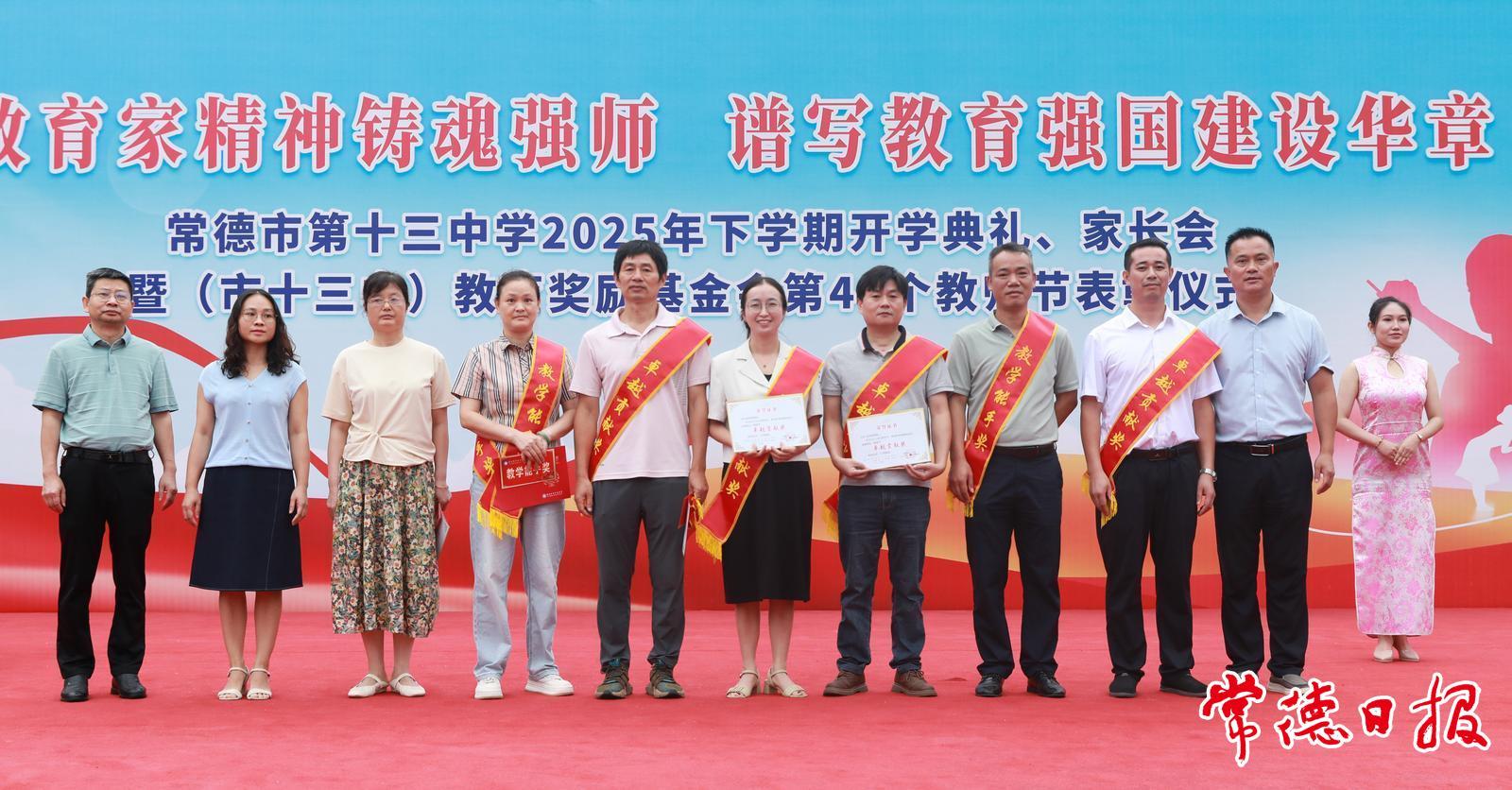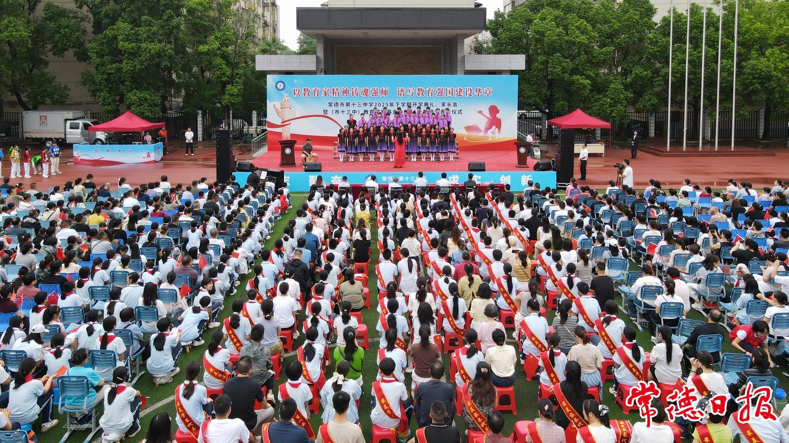 常德日報記者 李龍 通訊員 葉盼 文/圖 9月10日上午,常德市第十三中學舉辦2025年下學期開學典禮、家長會暨(市十三中)教育獎勵基金會第41個教師節表彰儀式。師生及家長3000多人共聚田徑場,手拿小國旗,齊唱《歌唱祖國》,共同歡慶節日的到來?;顒右浴耙越逃揖耔T魂強師,譜寫教育強國建設華章”為主題,旨在弘揚尊師重教風尚,推進師德師風建設。