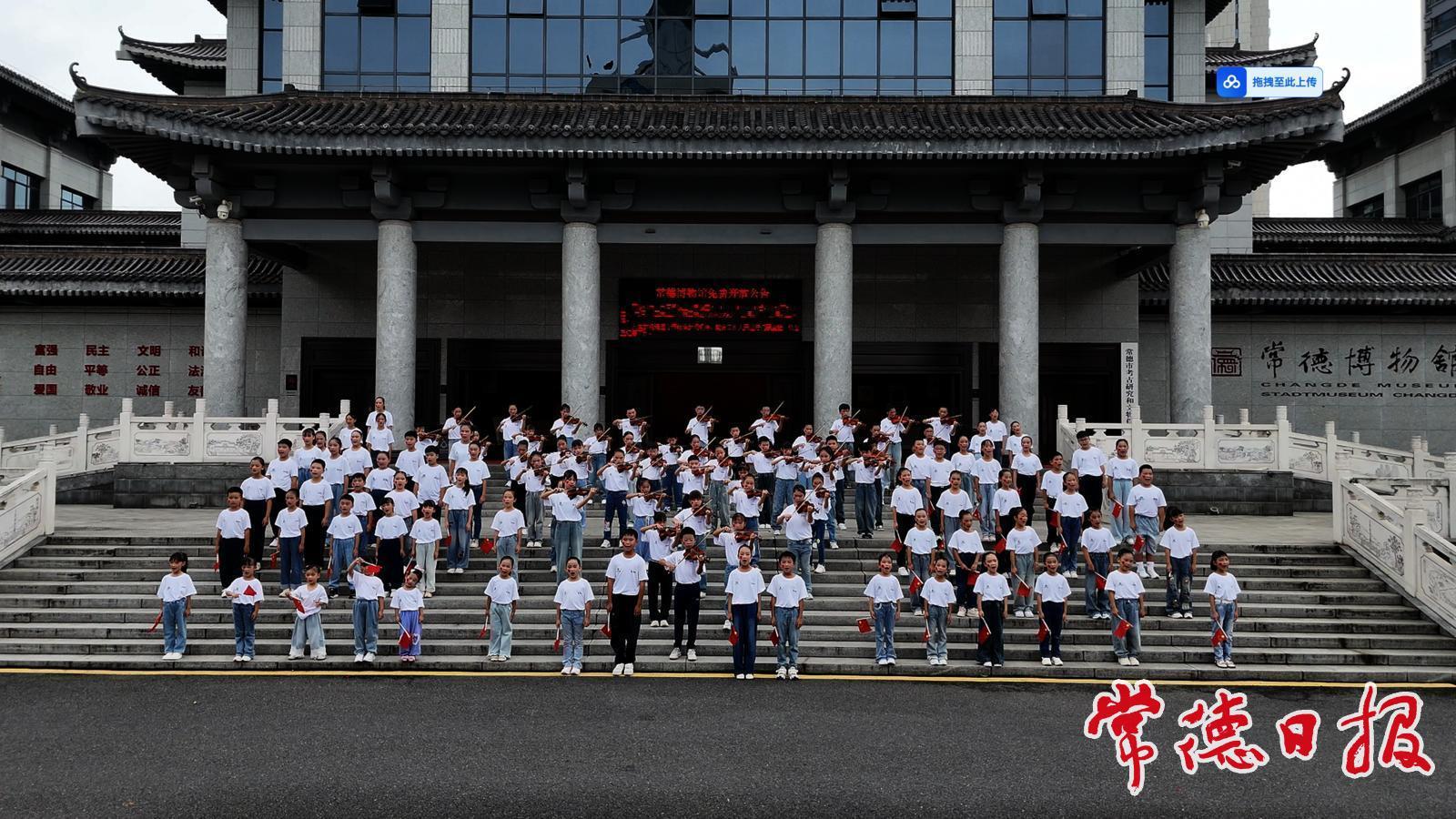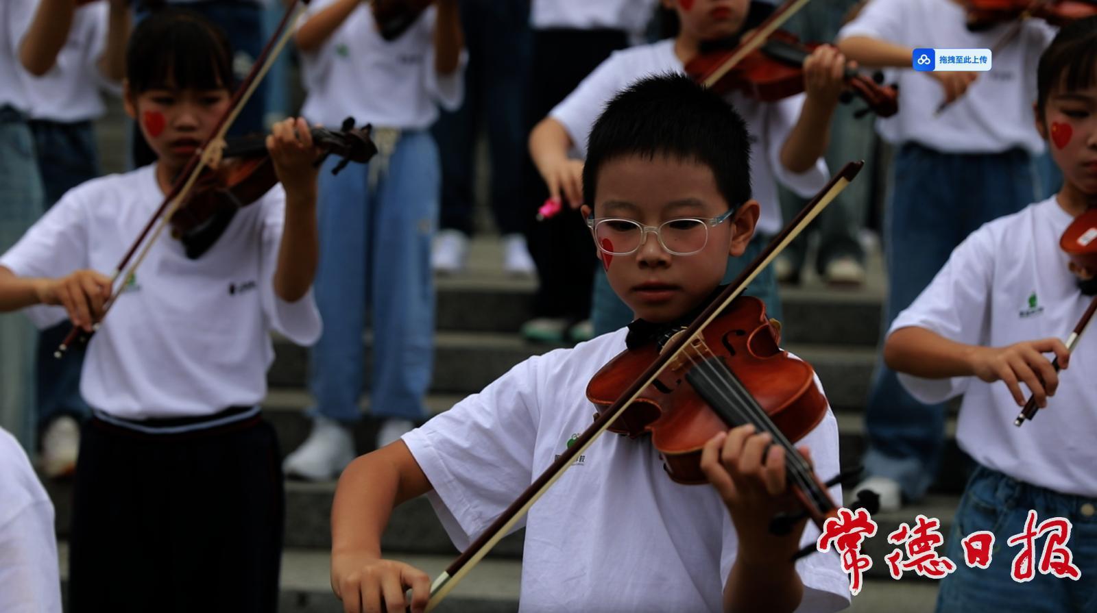 “站在常德這片沃土,讓歷史的回響與時代的強音,共同譜寫成禮贊祖國的圣歌。”隨著常德博物館講解員話音落下,幾名領唱員清亮的嗓音率先劃破周末清晨的寧靜,“紅星閃閃,放光彩……”熟悉的旋律瞬間點燃現場氛圍。緊接的是悠揚的小提琴聲合奏,以及百余名少年兒童齊聲高歌。他們精神抖擻,手中揮舞著鮮艷的旗幟,稚嫩而有力的合唱聲在博物館廣場上空回蕩。不少晨練或路過的市民紛紛駐足,有的舉起手機記錄下這意外而動人的一幕,有的則情不自禁地跟著旋律輕聲附和。