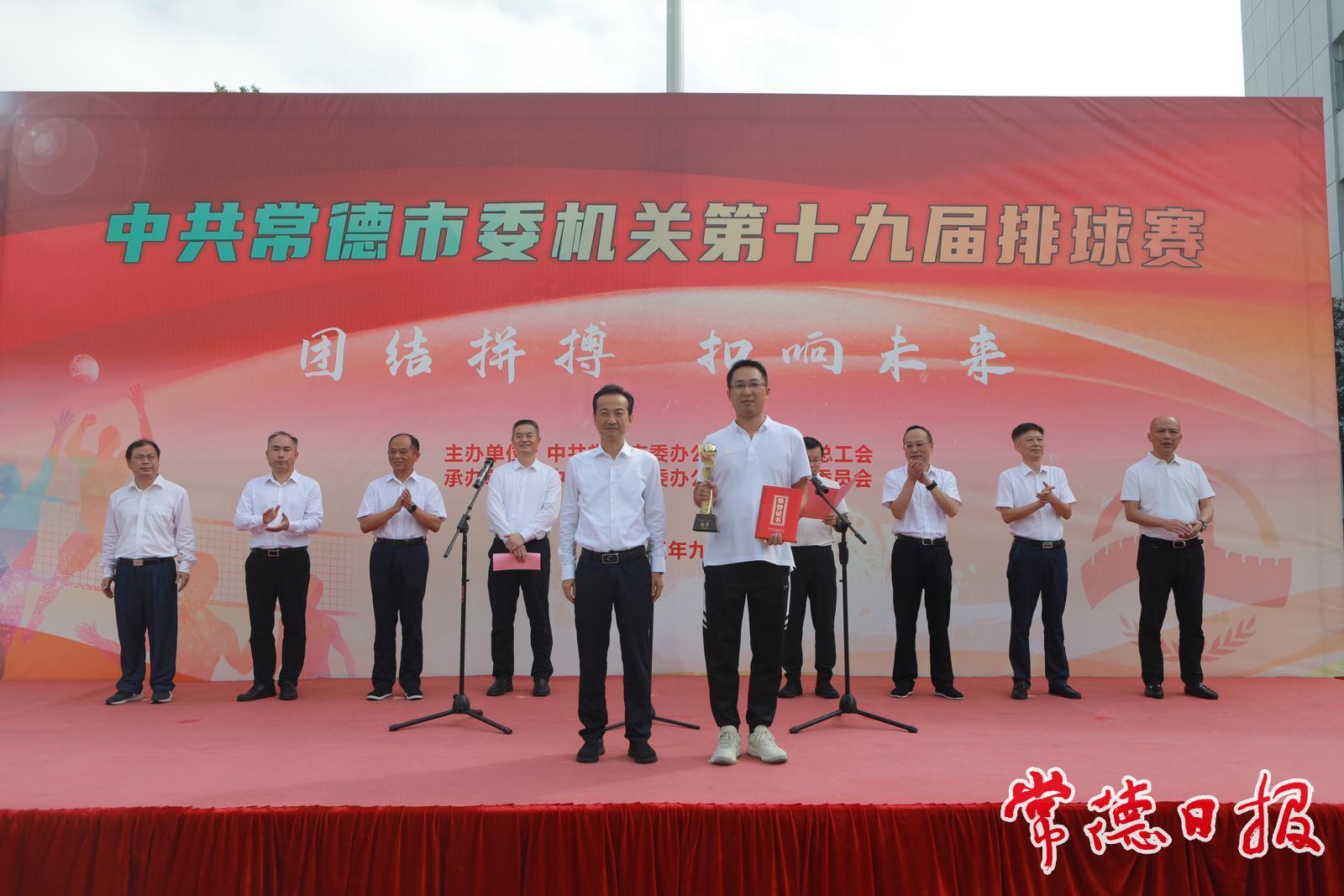 常德日報記者 王自來 文/圖 9月28日下午,“團結拼搏 ‘扣’響未來”中共常德市委機關第十九屆排球賽閉幕。市委常委、市委政法委書記、市委秘書長傅勇宣布比賽閉幕并為獲獎隊伍頒獎。