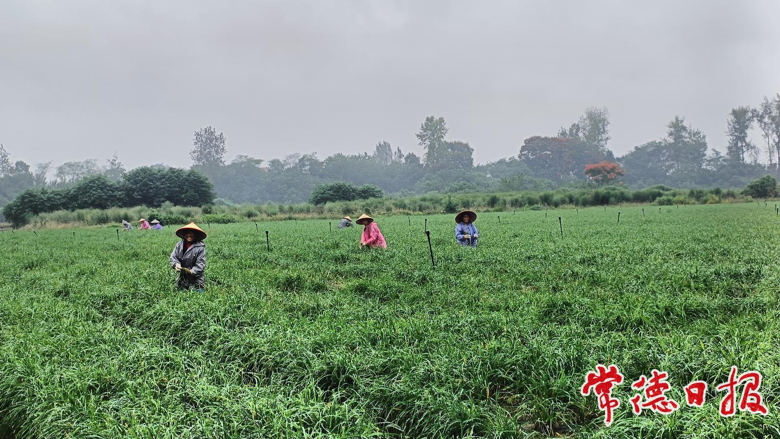 常德日?qǐng)?bào)記者 曾玉英 文/圖 9月27日,武陵區(qū)蘆荻山鄉(xiāng)蘆山社區(qū)居民穿著雨衣,在愛(ài)地蔬菜種植專(zhuān)業(yè)合作社冒雨采摘韭菜花。