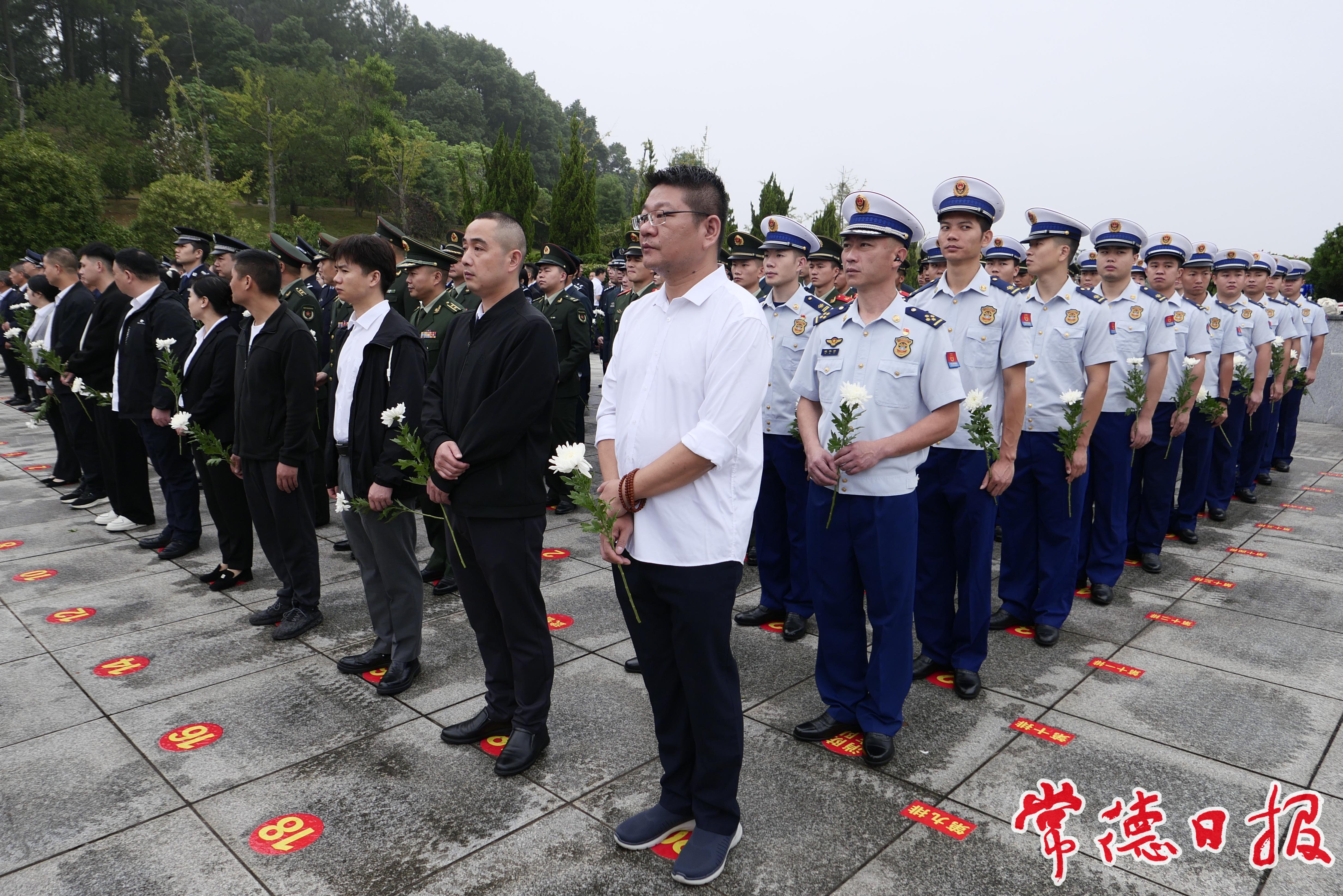 在深情的《獻花曲》中,禮兵將中共常德市委,市人大常委會,市政府,市政協,常德軍分區,各民主黨派常德市委會、市工商聯和無黨派愛國人士、各人民團體,常德市社會各界群眾,老戰士、老同志和烈士親屬,全市少先隊員敬獻的9個花籃托起,緩步拾級而上,在烈士紀念碑前排開。