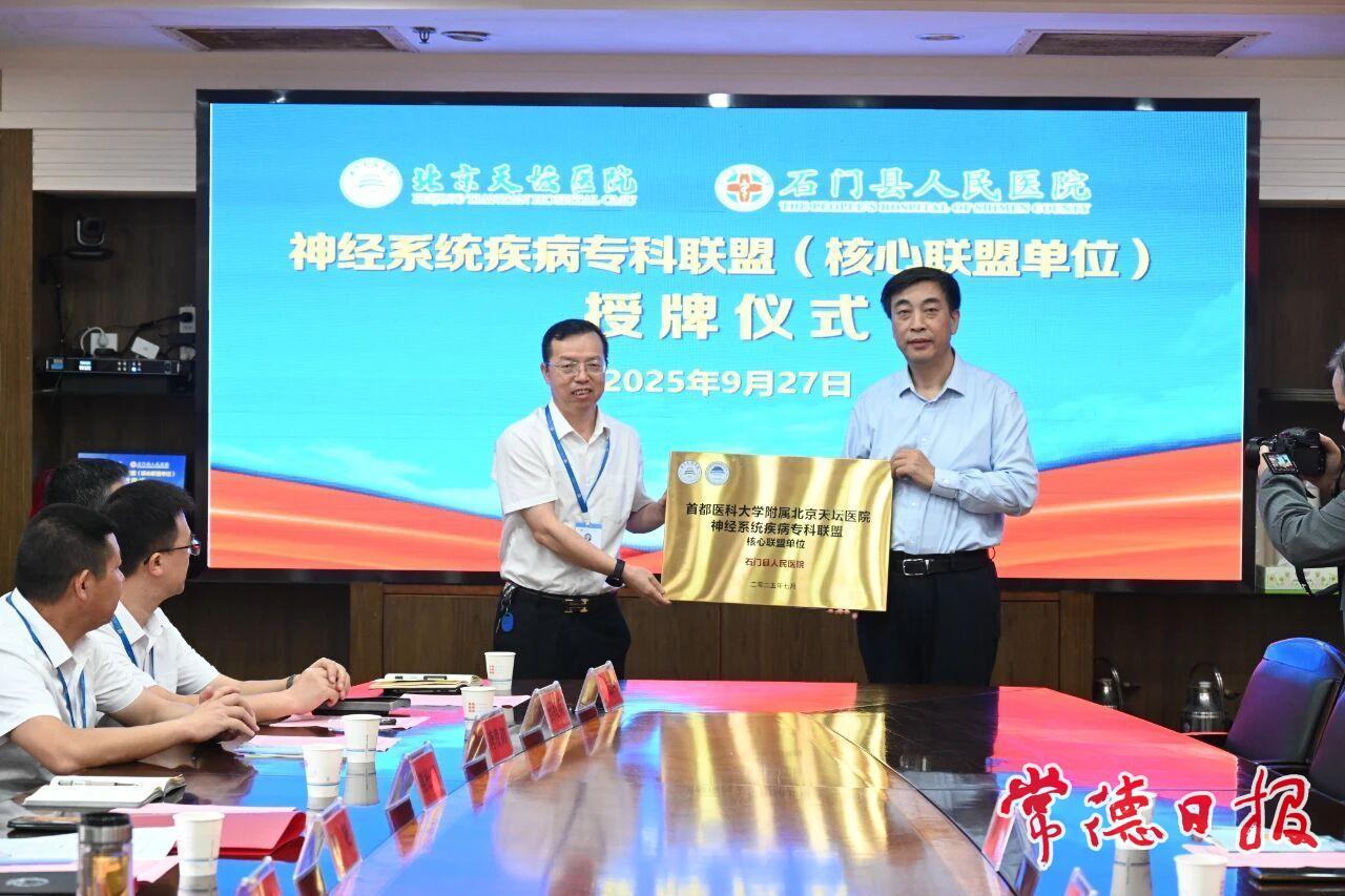常德日報記者 王浪 通訊員 梁雨虹 文/圖 9月27日上午,首都醫科大學附屬北京天壇醫院神經系統疾病專科聯盟授牌儀式在石門縣人民醫院舉行,該醫院正式被授予“核心聯盟單位”牌匾,成為湖南省唯一獲此資格的縣級醫院。