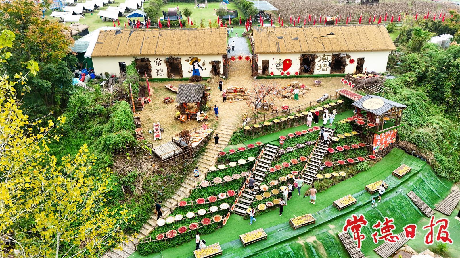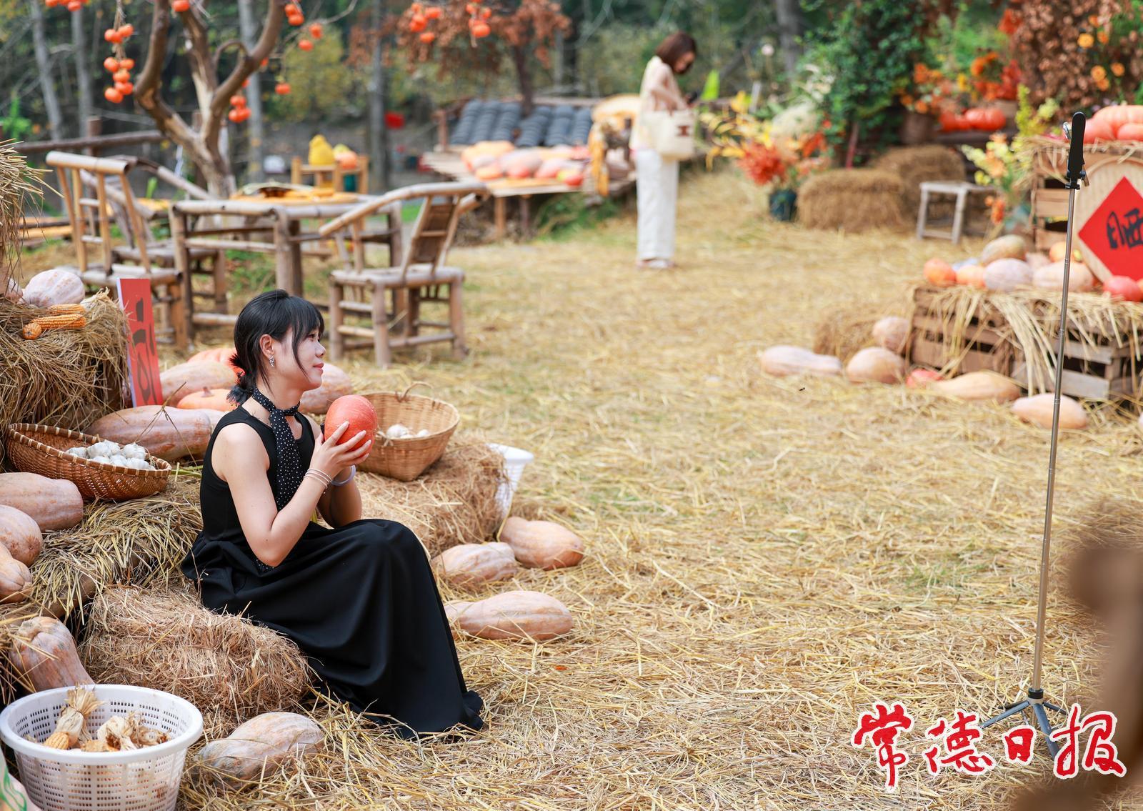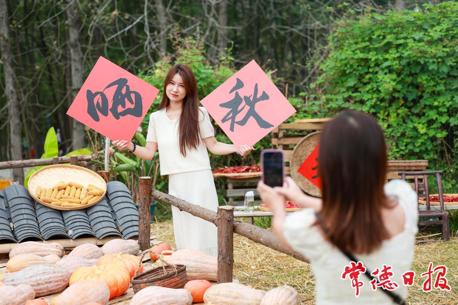 10月5日,常德市武陵區的丹野花田農場里五谷豐登、瓜果飄香,眾多游客前來打卡拍照,秋日氛圍濃厚,描繪出一幅生動的曬秋圖景。