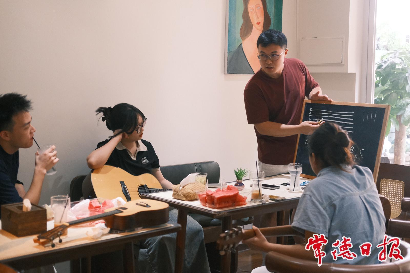 要說“躺平研究院”最妙的,就是總有意想不到的邂逅。2024年5月初,吉他演奏者左琦進店,戴明妍正巧在吧臺后為客人制作咖啡,見他背著一把古典吉他,便攀談起來。沒想到這一聊,竟發現他是一位吉他演奏者。