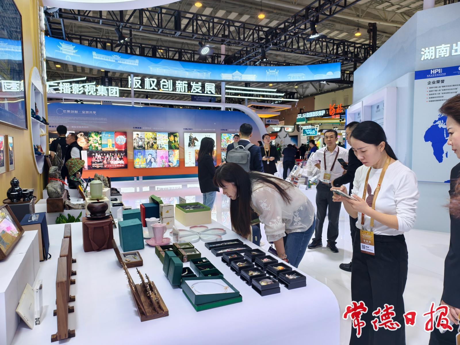 本屆版博會以“數(shù)智引領(lǐng)未來、版權(quán)創(chuàng)新發(fā)展”為主題,全面呈現(xiàn)當(dāng)前版權(quán)賦能產(chǎn)業(yè)高質(zhì)量發(fā)展的實(shí)踐成果。在湖南館展區(qū),常德武陵窯陶瓷、常德麻質(zhì)畫與長沙湘繡、銅官窯精品文創(chuàng)等湖湘瑰寶集中亮相,反映出版權(quán)促進(jìn)市場營銷、讓“文化資源”轉(zhuǎn)換為“產(chǎn)業(yè)資產(chǎn)”,不少嘉賓駐足記下產(chǎn)品版權(quán)信息和營銷聯(lián)絡(luò)方式。