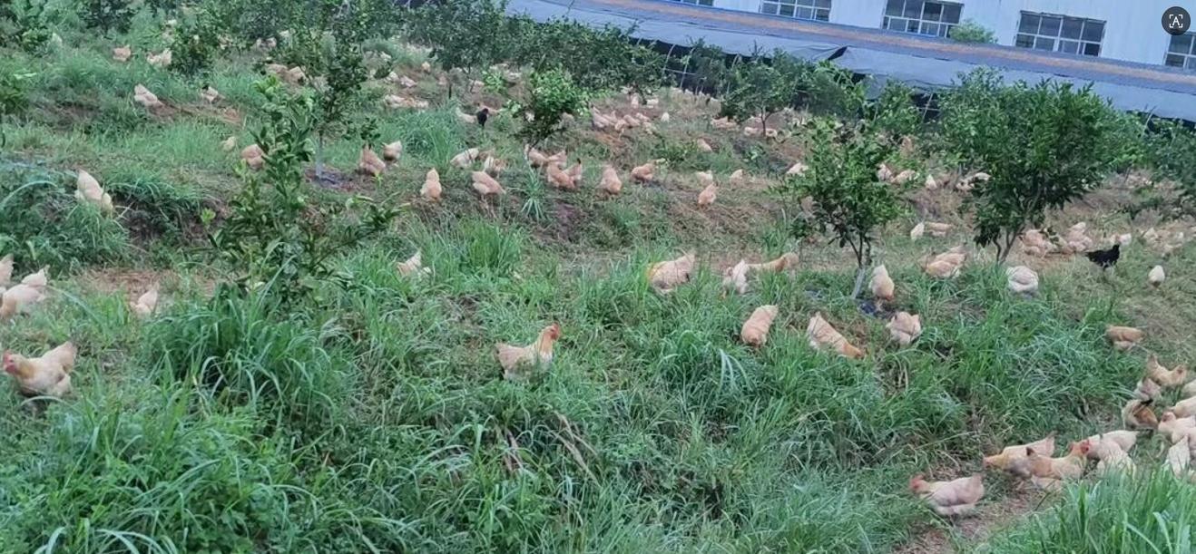 今年4月,經過集體商議,果園社區決定充分挖掘1400畝橘林的林下潛力,發展特色種養業。社區依托垚鑫農業專業合作社,聯合企業、種植大戶和養殖能手,在1100畝林下空地套種南瓜、大豆,并在300畝林間試點養殖生態土雞。4月底,合作社購入2500只雞苗,并聘請老黨員曾志倫負責管理。