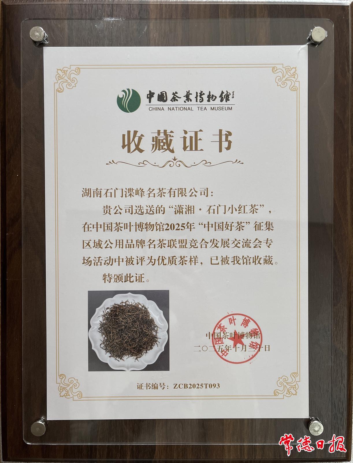 常德日報記者 王明睿 通訊員 龔維 文/圖 近日,在2025年中國區域公用品牌名茶聯盟競合發展交流會上,湖南石門渫峰名茶有限公司選送的“石門小紅茶”憑借卓越品質成功入選中國茶葉博物館“收藏茶樣”,并獲頒館藏證書,這是常德市茶葉產業又一重量級榮譽。