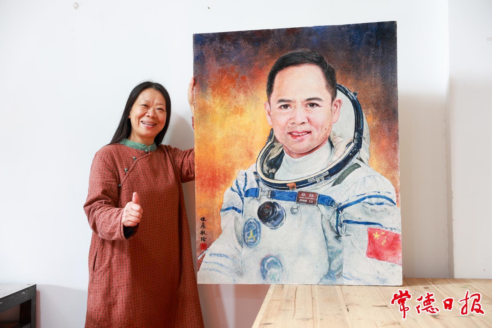 在位于常德河街的工作室里,非遺項目李氏藝術麻質畫代表性傳承人李健鷹以麻質畫的形式,精心繪制了一幅張陸的肖像,表達對英雄航天員的敬意。常德麻質畫以麻布為載體,以天然黃麻纖維設色,通過手撒麻纖維于麻布上繪制而成。李健鷹動情地說:“畫作的每一寸纖維,都浸潤著洞庭湖的靈氣,蘊藏著湖湘的風骨。”正如張陸的每一次出征,既承載著故土的深深期盼,也肩負著民族的浩瀚夢想——在家鄉的守望與星海的遠征之間,一種跨越天地的心靈共鳴,正激勵著更多常德兒女勇敢追夢、向上攀登。