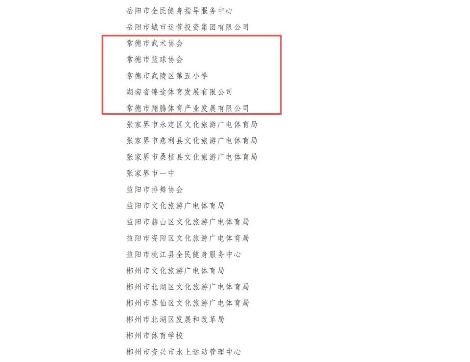 獲得先進單位稱號的常德市武術協會、常德市籃球協會、常德市武陵區第五小學、湖南省錦途體育發展有限公司、常德市翔騰體育產業發展有限公司,各自深耕領域、成效顯著。其中,常德市武術協會堅持研學結合,開展豐富武術活動,連續四年獲評省級先進;常德市籃球協會以賽事為軸心、公益為紐帶、青訓為根基,構建全齡參與的籃球生態,成為地方體育標桿;武陵區第五小學作為全國足球特色學校和省級網球傳統特色學校,秉持“健康為本、協調發展”理念,打造校園體育特色工程,組建多支競賽隊伍,助力學生終身體育發展;湖南省錦途體育發展有限公司聚焦體育場館運營、賽事策劃等多元服務,近四年承辦省級賽事約100場,年均開展公益活動20余場,曾獲評“2023年愛心單位”“2024年擁軍優屬聯盟單位”“武陵區創業之星”等榮譽;常德市翔騰體育產業發展有限公司自籌資金建設了五環山莊游泳訓練基地,2019年至今,該基地累計向省市輸送游泳運動員70余人,為體育人才培養筑牢根基。