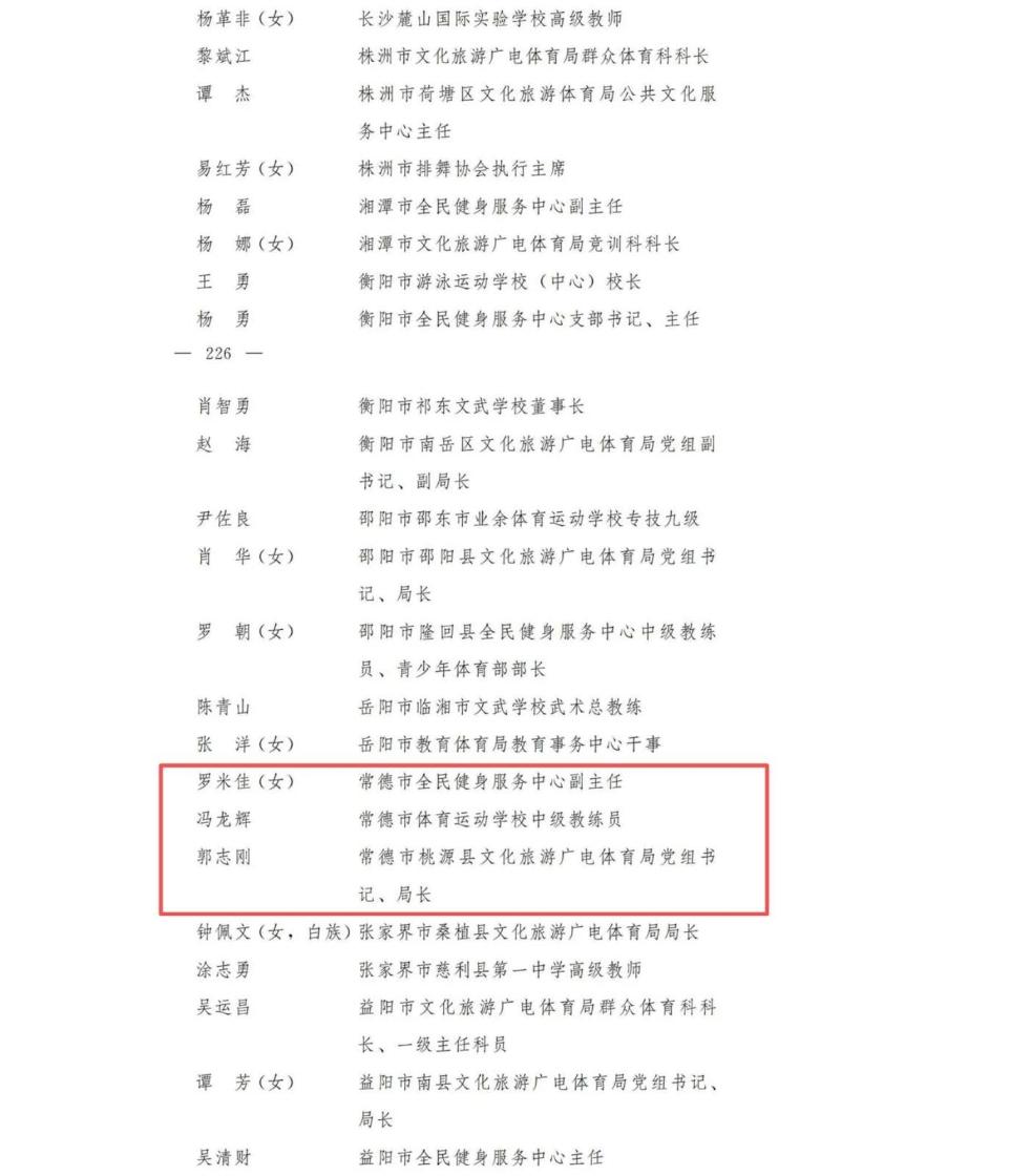 此次獲評先進個人的羅米佳、馮龍輝、郭志剛,深耕體育事業多年,貢獻突出。常德市全民健身服務中心副主任羅米佳扎根群體事業30余載,以創新為驅動、以惠民為宗旨,在黨建引領、青少年體育、賽事組織等領域成效卓著;常德市體育運動學校中級教練員馮龍輝自2006年投身工作以來,堅守訓練一線,帶領隊伍在省級比賽中屢獲金牌,斬獲多項省市級榮譽;時任桃源縣文旅廣體局黨組書記、局長(現任湖南桃源烏云界國家級自然保護區管理局黨委書記、局長)的郭志剛,推動全縣群眾體育蓬勃發展、競技水平穩步提升,積極謀劃建設“口袋文體公園”,將其納入2025年“為群眾辦實事”項目,目前該項目已啟動實施。
