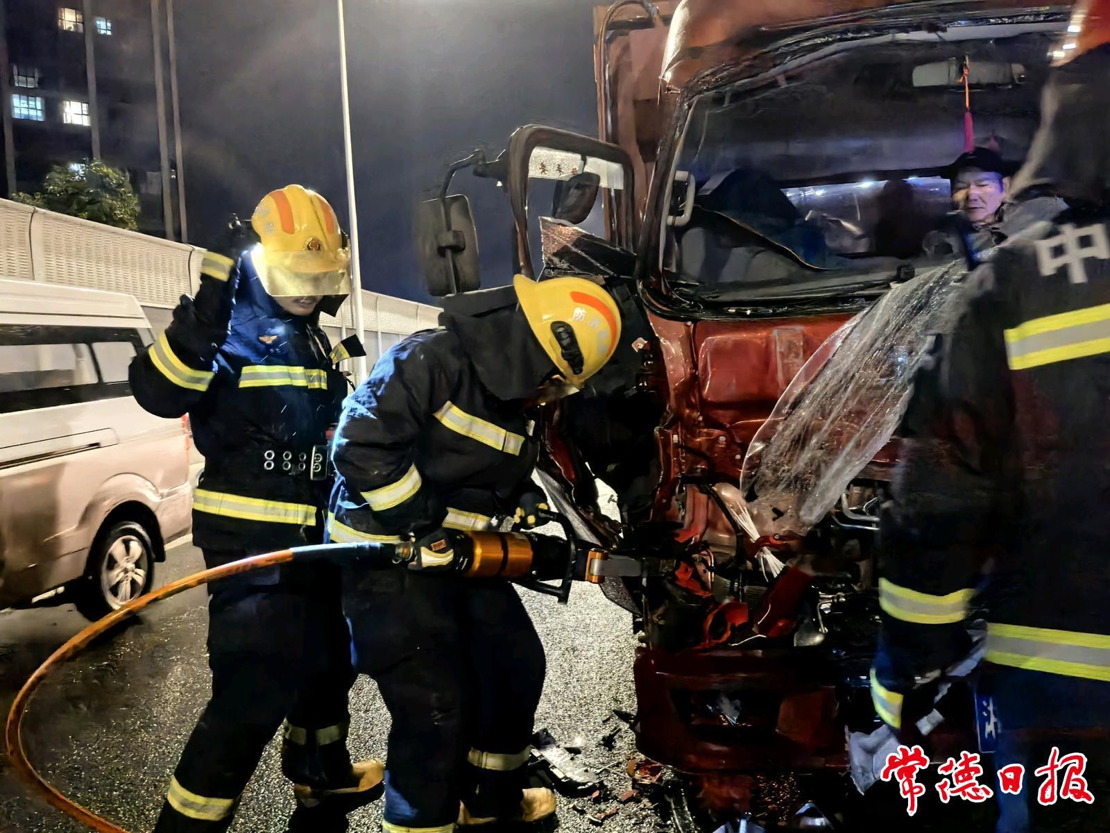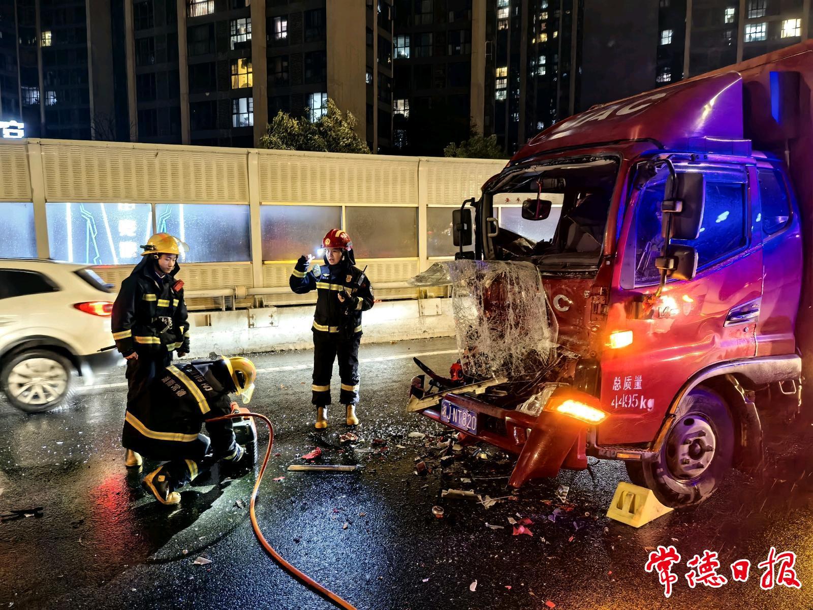 常德日報記者 蔡文龍 通訊員 王曉艷 文/圖 11月17日19時許,常德經開區消防救援大隊接到報警:在德山大橋上,常德經開區往武陵區方向約800米處發生一起追尾事故,一名隨車人員因腿部被卡,困于駕駛室內。接警后,德山消防救援站迅速出動,趕赴現場展開救援。