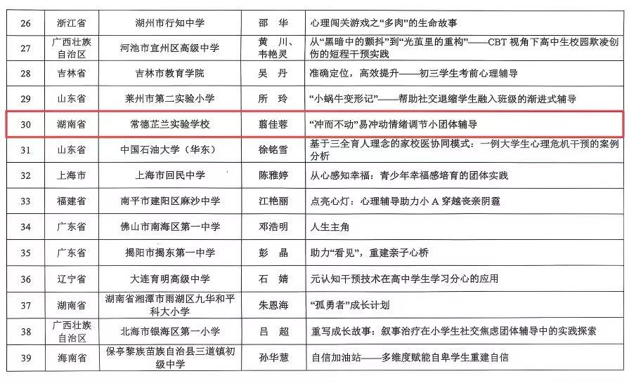 常德日報記者 裴維維 通訊員 魏來 文/圖 近日,教育部學(xué)生服務(wù)與素質(zhì)發(fā)展中心公布“向陽花學(xué)生心理健康促進行動”典型案例征集評選結(jié)果,全國101個案例脫穎而出,湖南省2個案例成功入選。其中,常德芷蘭實驗學(xué)校心理健康學(xué)科教研負責(zé)人翦佳蓉撰寫的案例——《“沖而不動”易沖動情緒調(diào)節(jié)小團體輔導(dǎo)》被評為典型案例。