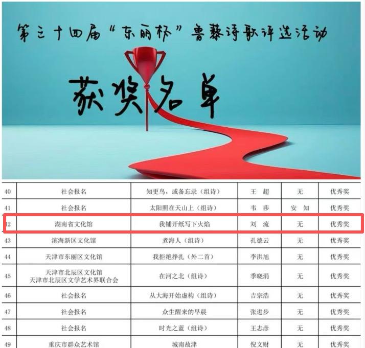 在全國性文學賽事中,常德作協作家表現亮眼。第八屆“貴州大曲杯·記憶里的味道”全國征文大賽上,作協副主席許玲承載著濃厚鄉土人情與童年溫情時光的作品《風扇轉黃瓜甜甜酒飄香》獲三等獎;主席團委員戴志剛語言質樸、充滿生活氣息的作品《母親的壇壇罐罐》,斬獲三等獎,他們用文字勾勒出歲月里的煙火氣息與人文情懷,引發讀者廣泛共鳴。第三十四屆“東麗杯”魯藜詩歌評選活動中,作家劉流創作的詩歌《我鋪開紙寫下火焰》憑借深刻的情感表達與獨特的藝術筆觸,榮獲優秀獎。