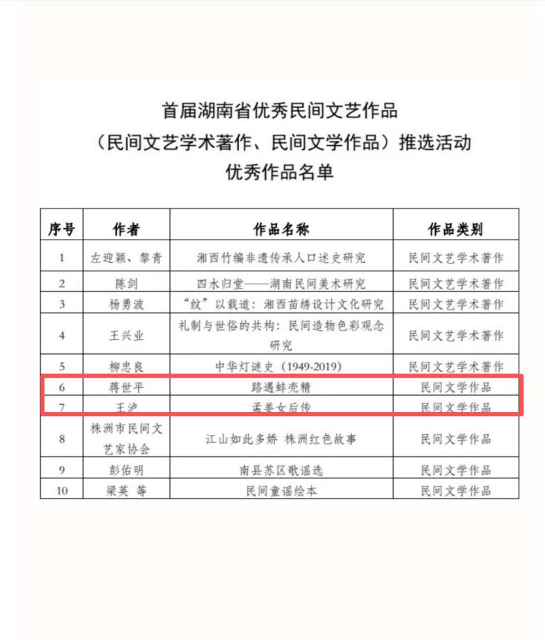 省級評選中,常德作協同樣收獲頗豐。首屆湖南省優秀民間文藝作品推選活動評審公示結果顯示,作家蔣世平的《路遇蚌殼精》與王滬的《孟姜女后傳》兩部民間文學作品憑借深厚的文化底蘊和生動的故事演繹,成功入選優秀作品獎,為常德民間文學的傳承與創新增添了一抹亮色。