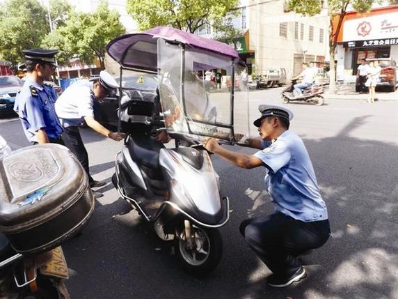 圖為交警執(zhí)法人員在拆卸遮陽傘。
