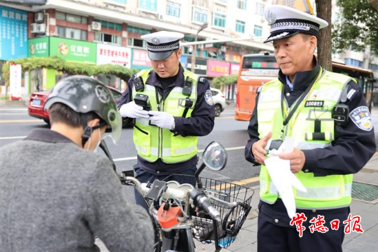 10月4日,常德公安交警部門啟動為期3個月的摩托車、電動車專項整治行動,著力推動全市摩托車、電動車駕乘人員“兩升一降”(安全頭盔佩戴率上升,學習教育率上升,交通違法率下降)。圖為10月10日,常德公安交警直屬二大隊在市城區朗州路與建設路交會處開展專項整治行動。 徐珊珊 攝